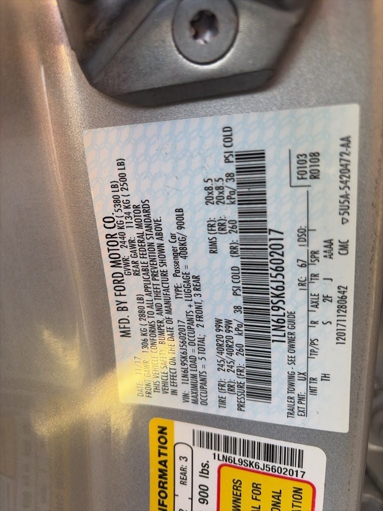 Continental Select, 4D Sedan, 3.7L V6 Ti-VCT 24V, 6-Speed Automatic, FWD, Ingot Silver, Ebony Leather, 10 Speakers, 20 Polished Aluminum Wheels, 4-Wheel Disc Brakes, ABS brakes, Adaptive suspension, Air Conditioning, Alloy wheels, AM/FM radio: SiriusXM, AppLink/Apple CarPlay and Android Auto, Auto tilt-away steering wheel, Auto-dimming door mirrors, Automatic temperature control, BLIS Blind Spot Info System w/Cross-Traffic Alert, Brake assist, Bumpers: body-color, Compass, Delay-off headlights, Door auto-latch, Driver door bin, Driver vanity mirror, Dual front impact airbags, Dual front side impact airbags, Electronic Stability Control, Emergency communication system: 911 Assist, Equipment Group 200A, Exterior Parking Camera Rear, Four wheel independent suspension, Front anti-roll bar, Front Bucket Seats, Front Center Armrest, Front dual zone A/C, Front License Plate Bracket, Front reading lights, Fully automatic headlights, Garage door transmitter, Genuine wood console insert, Genuine wood dashboard insert, Genuine wood door panel insert, Heated door mirrors, Heated front seats, High-Intensity Discharge Headlights, Illuminated entry, Knee airbag, Leather steering wheel, Low tire pressure warning, Luxury Leather Heated Front Seat, Memory seat, Occupant sensing airbag, Outside temperature display, Overhead airbag, Overhead console, Panic alarm, Passenger door bin, Power door mirrors, Power driver seat, Power passenger seat, Power steering, Power windows, Radio data system, Radio: AM/FM Stereo w/10 Speakers, Rear anti-roll bar, Rear reading lights, Rear seat center armrest, Rear window defroster, Remote keyless entry, Security system, Select Plus, SiriusXM Radio, Speed control, Speed-sensing steering, Split folding rear seat, Steering wheel memory, Steering wheel mounted A/C controls, Steering wheel mounted audio controls, SYNC 3 Communications & Entertainment System, Tachometer, Telescoping steering wheel, Tilt steering wheel, Traction control, Trip computer, Turn signal indicator mirrors, Variably intermittent wipers, Voice-Activated Touchscreen Navigation System, Wheels: 19 Prem Dark Stainless Painted Aluminum.