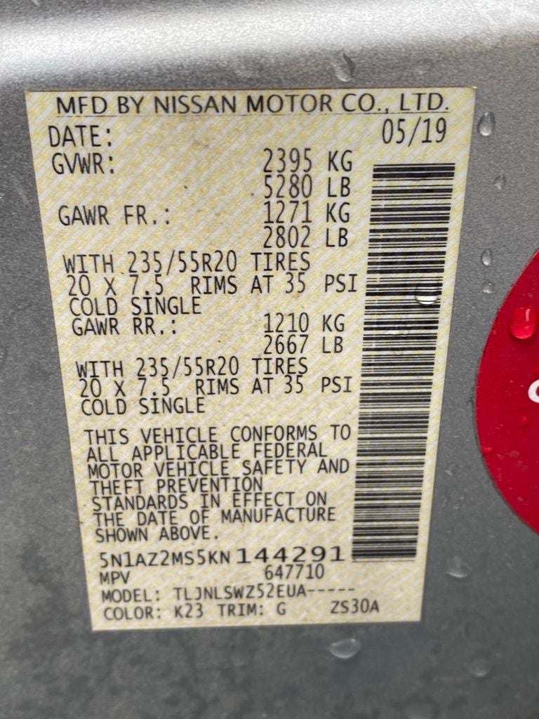 CVT with Xtronic, AWD, 11 Speakers, 4-Wheel Disc Brakes, 4.667 Axle Ratio, ABS brakes, Air Conditioning, Alloy wheels, AM/FM radio: SiriusXM, AM/FM/CD/MP3/WMA Audio System, Auto High-beam Headlights, Auto tilt-away steering wheel, Auto-dimming Rear-View mirror, Automatic temperature control, Blind Spot Warning, Brake assist, Bumpers: body-color, Cargo Area Protector, Cargo Net, Cargo Package, Carpeted Floor Mats & Carpeted Cargo Mat, CD player, Child-Seat-Sensing Airbag, Climate-Controlled Front Bucket Seats, Compass, Delay-off headlights, Driver door bin, Driver vanity mirror, Dual front impact airbags, Dual front side impact airbags, Electronic Stability Control, Emergency communication system: NissanConnect Services, First Aid Kit, Four wheel independent suspension, Front anti-roll bar, Front Bucket Seats, Front Center Armrest, Front dual zone A/C, Front fog lights, Front reading lights, Fully automatic headlights, Garage door transmitter: HomeLink, Heated door mirrors, Heated front seats, Heated rear seats, Heated steering wheel, Illuminated entry, Knee airbag, Low tire pressure warning, Memory seat, Navigation system: NissanConnect Navigation, NissanConnect featuring Apple CarPlay and Android Auto, NissanConnect Services Powered By SiriusXM, Occupant sensing airbag, Outside temperature display, Overhead airbag, Overhead console, Panic alarm, Passenger door bin, Passenger vanity mirror, Power door mirrors, Power driver seat, Power Liftgate, Power moonroof, Power passenger seat, Power steering, Power windows, Radio data system, Rear anti-roll bar, Rear Bumper Protector, Rear reading lights, Rear seat center armrest, Rear side impact airbag, Rear window defroster, Rear window wiper, Remote keyless entry, Retractable Cargo Cover, Roof rack: rails only, Security system, Semi-Aniline Leather-Appointed Seat Trim, Speed control, Speed-sensing steering, Speed-Sensitive Wipers, Splash Guards, Split folding rear seat, Spoiler, Steering wheel memory, Steering wheel mounted audio controls, Tachometer, Telescoping steering wheel, Tilt steering wheel, Traction control, Trip computer, Turn signal indicator mirrors, Variably intermittent wipers, Ventilated front seats, Wheels: 20 Dark Hyper Silver, CVT with Xtronic, AWD.