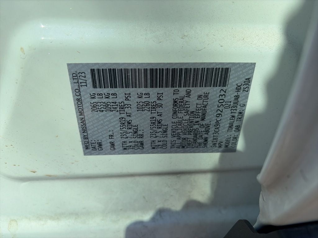 19 Aluminum Alloy Wheels, 4-Wheel Disc Brakes, 5.604 Axle Ratio, 6 Speakers, ABS brakes, Air Conditioning, Alloy wheels, AM/FM Radio, AM/FM radio: SiriusXM, Auto High-beam Headlights, Auto-dimming Rear-View mirror, Automatic temperature control, Black Splash Guards (Set of 4), Bose Premium Audio System, Brake assist, Bumpers: body-color, Chrome Rear Bumper Protector, Delay-off headlights, Driver door bin, Driver vanity mirror, Dual front impact airbags, Dual front side impact airbags, Electronic Stability Control, Emergency communication system: NissanConnect Services, External Ground Lighting, First Aid Kit, Floor Mats w/2-Piece Cargo Area Protector, Four wheel independent suspension, Frameless Rearview Mirror w/Universal Remote, Front anti-roll bar, Front Bucket Seats, Front Center Armrest, Front dual zone A/C, Front reading lights, Front, Side & Rear Sonar, Fully automatic headlights, Heated door mirrors, Heated Front Bucket Seats, Heated front seats, Heated steering wheel, Illuminated entry, Interior Accent Lighting, Knee airbag, Leather steering wheel, Leather-Appointed Seat Trim, Low tire pressure warning, Memory seat, Motion Activated Power Liftgate, NissanConnect featuring Apple CarPlay and Android Auto, Occupant sensing airbag, Outside temperature display, Overhead airbag, Overhead console, Panic alarm, Passenger door bin, Passenger vanity mirror, Power door mirrors, Power driver seat, Power Liftgate, Power moonroof, Power passenger seat, Power steering, Power windows, ProPILOT Assist w/Navi-link, Radio data system, Radio: AM/FM NissanConnect w/Navigation, Rear anti-roll bar, Rear Door Sunshades, Rear Parking Sensors, Rear reading lights, Rear seat center armrest, Rear side impact airbag, Rear window defroster, Rear window wiper, Remote keyless entry, Retractable Cargo Cover, Security system, SL Premium Package, Speed control, Speed-Sensitive Wipers, Split folding rear seat, Spoiler, Steering wheel mounted audio controls, Tachometer, Telescoping steering wheel, Tilt steering wheel, Traction control, Traffic Sign Recognition, Tri-Zone HVAC, Trip computer, Turn signal indicator mirrors, USB Charging Cable Set - Nissan, Variably intermittent wipers.