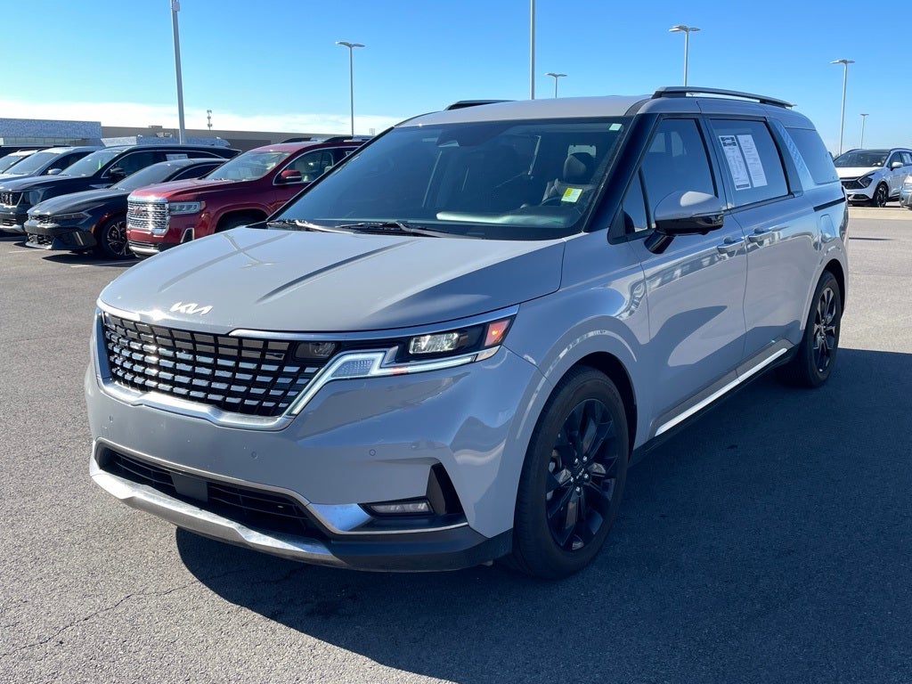 KIA Certified Eligible Certified, 10 Speakers, 3.51 Axle Ratio, 3rd row seats: split-bench, 4-Wheel Disc Brakes, ABS brakes, Air Conditioning, Alloy wheels, AM/FM radio: SiriusXM, Apple CarPlay & Android Auto, Artificial Leather Seat Trim, Auto High-beam Headlights, Automatic temperature control, Brake assist, Bumpers: body-color, Carpeted Floor Mats (8-Passenger), Compass, Delay-off headlights, Driver door bin, Driver vanity mirror, Dual front impact airbags, Dual front side impact airbags, Dual Screen Rear Seat Entertainment System, Electronic Stability Control, Emergency communication system, Exterior Parking Camera Rear, Four wheel independent suspension, Front anti-roll bar, Front Bucket Seats, Front Center Armrest, Front dual zone A/C, Front fog lights, Front reading lights, Fully automatic headlights, Heated & Ventilated Front Bucket Seats, Heated door mirrors, Heated front seats, Illuminated entry, Knee airbag, Leather Shift Knob, Leather steering wheel, Low tire pressure warning, Memory seat, Navigation System, Occupant sensing airbag, Outside temperature display, Overhead airbag, Overhead console, Panic alarm, Passenger door bin, Passenger vanity mirror, Power door mirrors, Power driver seat, Power Liftgate, Power passenger seat, Power steering, Power windows, Radio: AM/FM/HD Audio System, Rear air conditioning, Rear anti-roll bar, Rear reading lights, Rear Seat Entertainment Package, Rear window defroster, Rear window wiper, Reclining 3rd row seat, Remote keyless entry, Roof rack: rails only, Security system, Speed control, Speed-sensing steering, Split folding rear seat, Spoiler, Steering wheel mounted audio controls, Tachometer, Telescoping steering wheel, Tilt steering wheel, Traction control, Trip computer, Turn signal indicator mirrors, Variably intermittent wipers, Ventilated front seats, Wheels: 7.5J x 19 Black Painted Alloy.